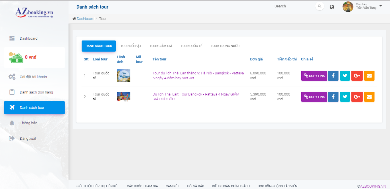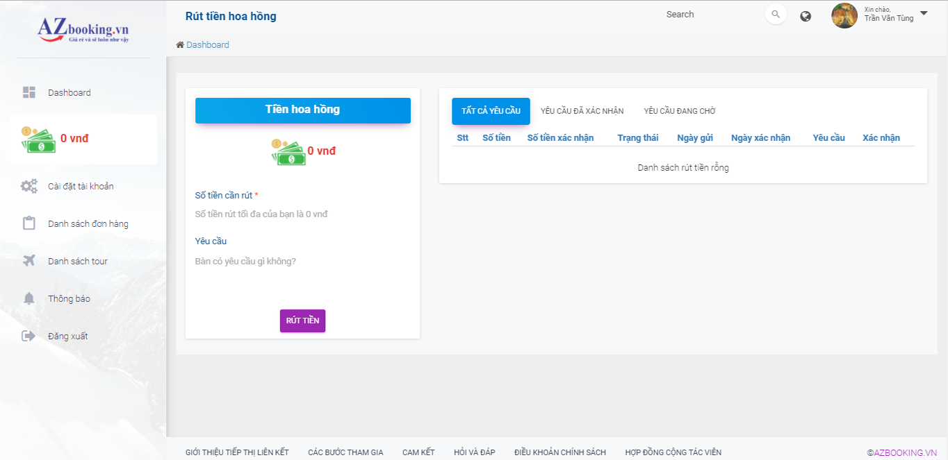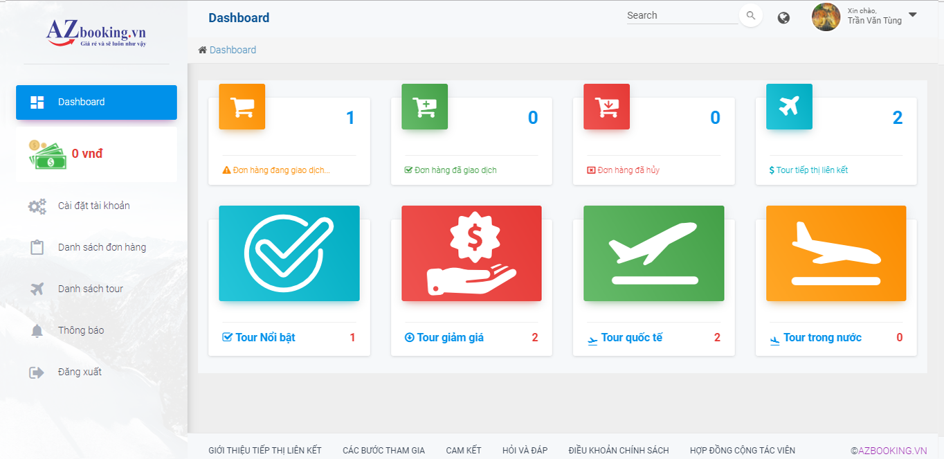 Trang quản trị hệ thống Tiếp thị liên kết của AZbooking thể hiện rõ ràng và minh bạch các tính năng cần thiết